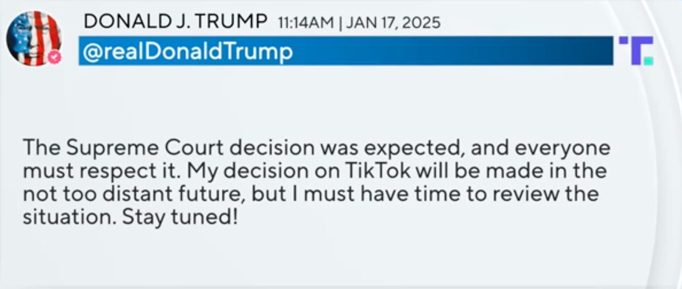 当天早些时候,美国联邦最高法院裁定TikTok“不卖就禁用”的法律不违宪。这意味着最高法院允许该法案按原计划于19日生效。